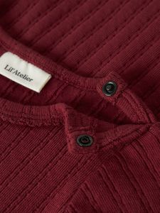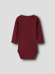 Søt mørkerød body med fine mønster i stoffet.